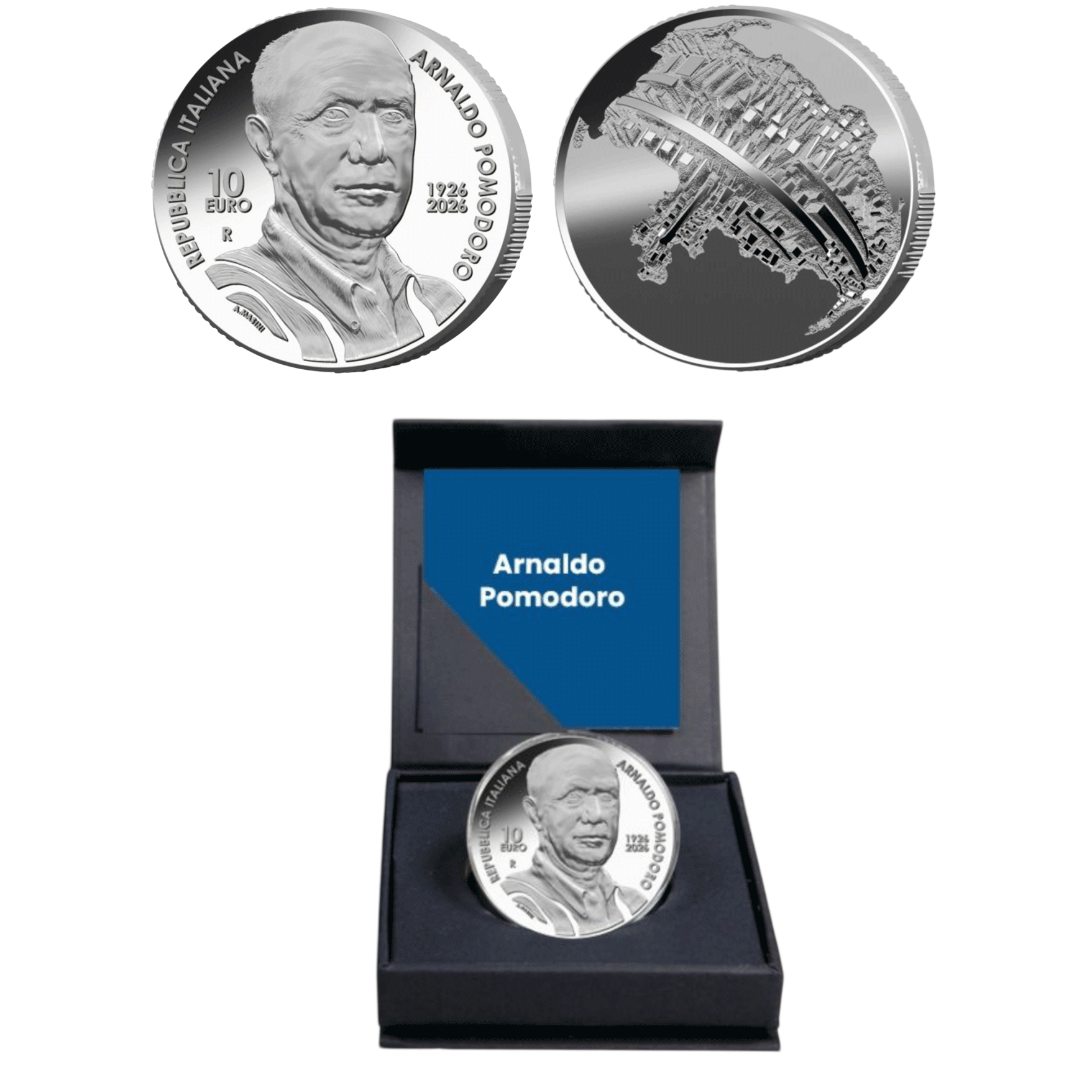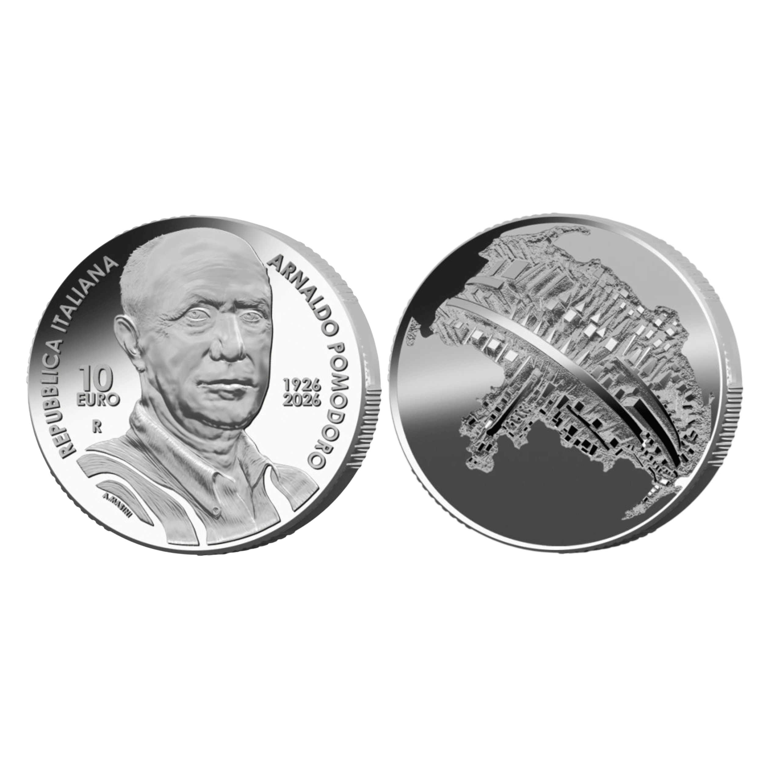 Dritto: al centro è raffigurato il noto scultore Arnaldo Pomodoro. Nel giro sono poste le scritte “REPUBBLICA ITALIANA” e “ARNALDO POMODORO”, rispettivamente, a sinistra e destra. Nel campo a sinistra sono posti il valore nominale “10 EURO” e la “R” identificativa della Zecca di Roma. Nel campo a destra sono poste le due date “1926” e “2026”, rispettivamente, anno di nascita dell’artista e anno di emissione della moneta. In basso a sinistra è posta la firma dell’autore della moneta “A.MASINI”.