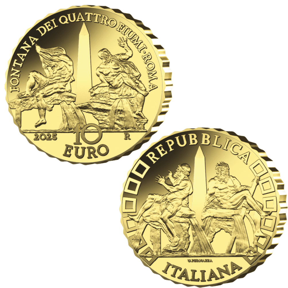 Rovescio: Riprodotto al centro il particolare di due dei quattro fiumi ovvero, a sinistra la statua del Nilo ed a destra la statua del Rio de la Plata, separati dall’obelisco. Nel giro, in alto la scritta “FONTANA DEI QUATTRO FIUMI” è separata da un pallino dalla scritta “ROMA”. In basso al centro, il valore nominale “10 EURO”, a sinistra l’anno di emissione “2025” mentre a destra “R” identificativo della Zecca di Roma.