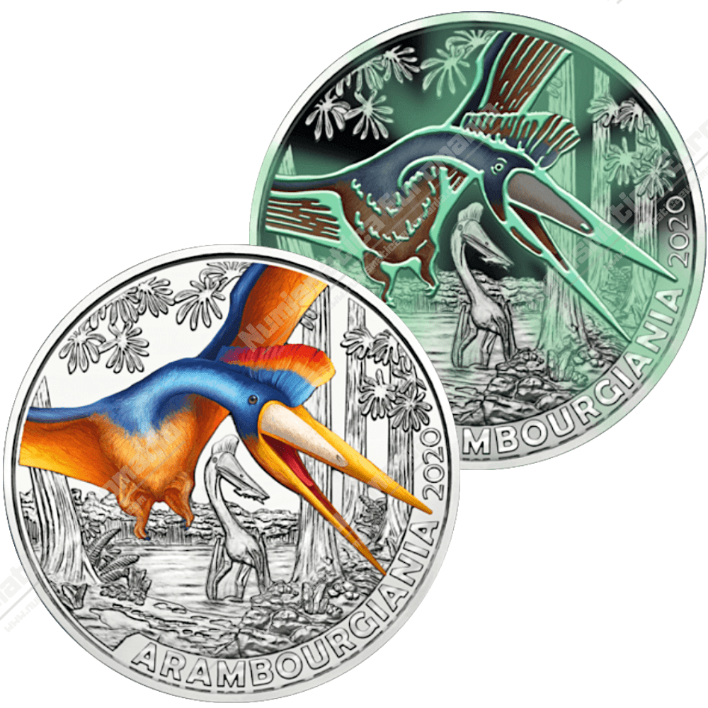 L’Arambourgiania presenta tutti e 12 gli animali preistorici estremi della serie Supersaurs in sagoma sul suo fronte, mentre l’Arambourgiania stampata a colori è mostrata nel suo habitat preistorico nativo sul retro bagliore nel buio della moneta. Le monete da 3 euro Supersaurs hanno corso legale in Austria.