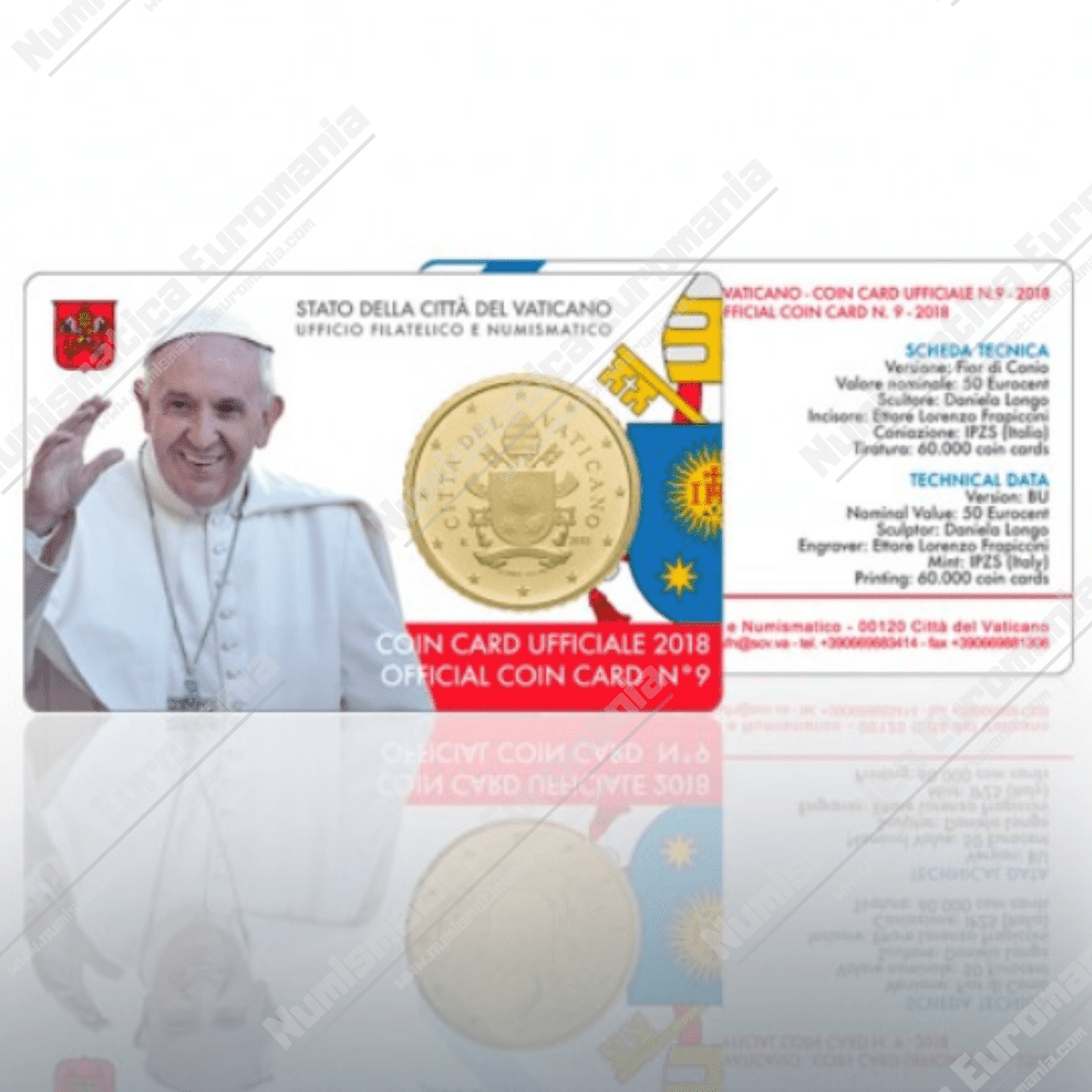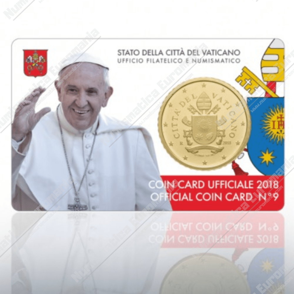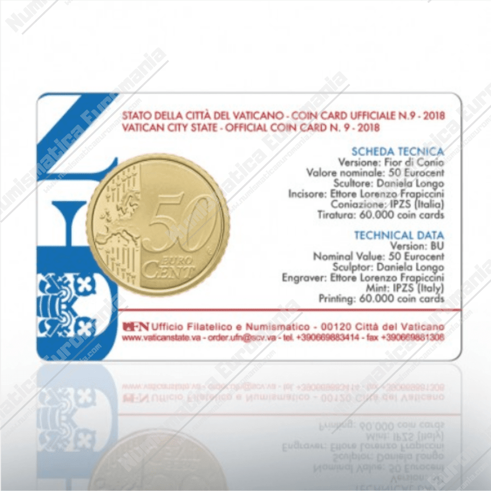 | L’Ufficio Filatelico e Numismatico presenta la Vatican Coin Card N. 9, un blister raffigurante il Santo Padre e contenente una moneta da 50 centesimi di Euro del millesimo 2018. |