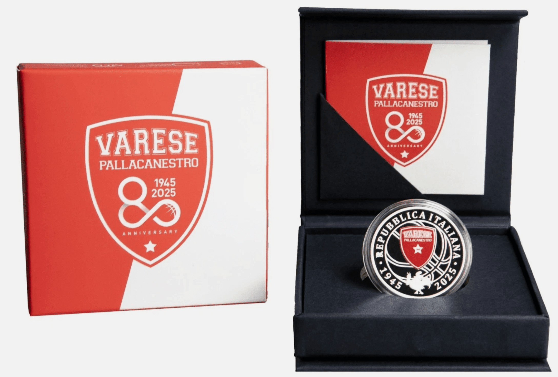 Dritto: in primo piano, al centro, è rappresentato il logo ufficiale della Pallacanestro Varese. Sullo sfondo è raffigurato un pallone da pallacanestro. Nel giro la scritta “REPUBBLICA ITALIANA” e le date “1945”, anno di nascita della squadra, e “2025”, anno di emissione della moneta. In basso è rappresentata la mascotte della Pallacanestro Varese. Moneta con elementi colorati.