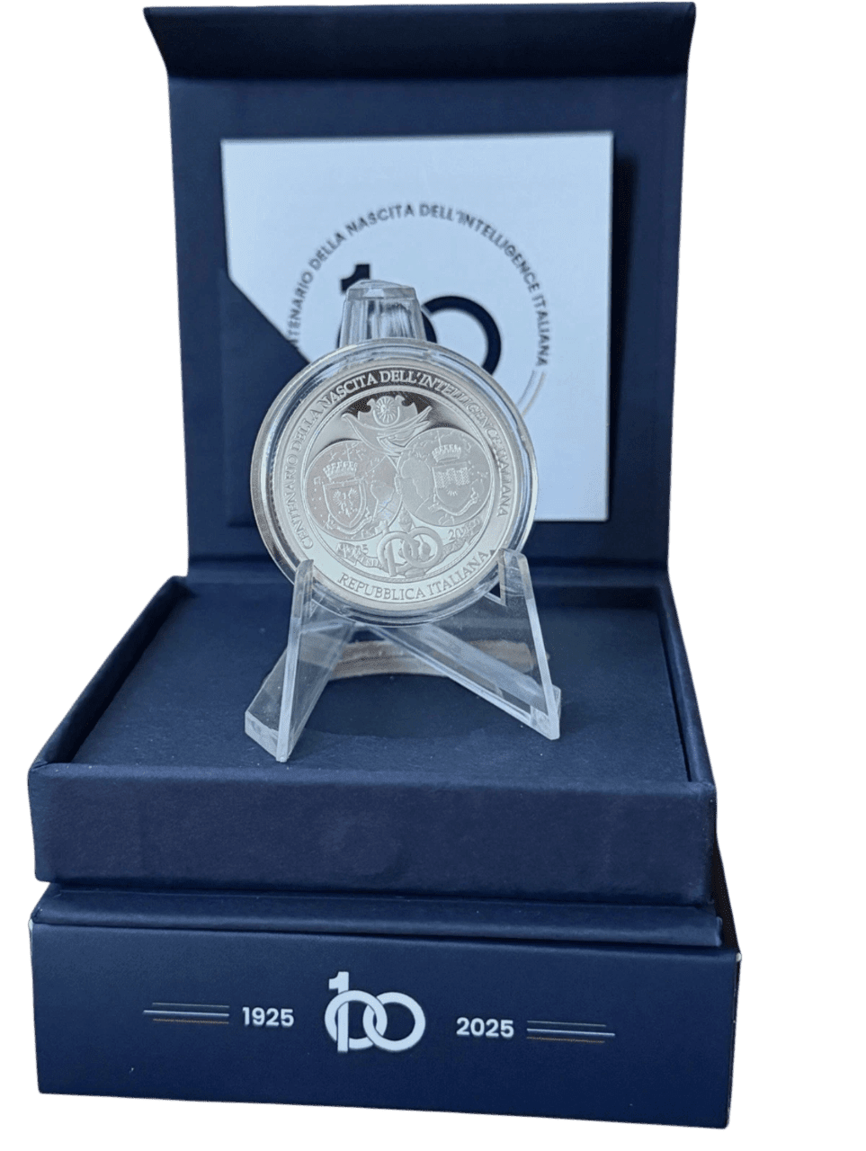 Dritto: in alto, il logo del Sistema di Informazione per la Sicurezza della Repubblica che rappresenta DIS, AISI e AISE; al centro, gli stemmi araldici dell’AISE, sulla sinistra, e dell’AISI, sulla destra. In basso il “100”, esplicativo del centenario, è posto al centro delle date 1925 e 2025. Sullo sfondo il logo storico del Sismi. Nel giro in alto la scritta “CENTENARIO DELLA NASCITA DELL’ INTELLIGENCE ITALIANA”, mentre in basso, sempre nel giro, la scritta “REPUBBLICA ITALIANA”.