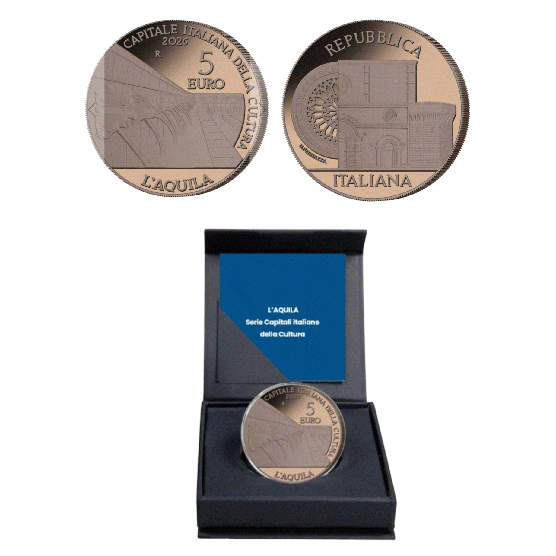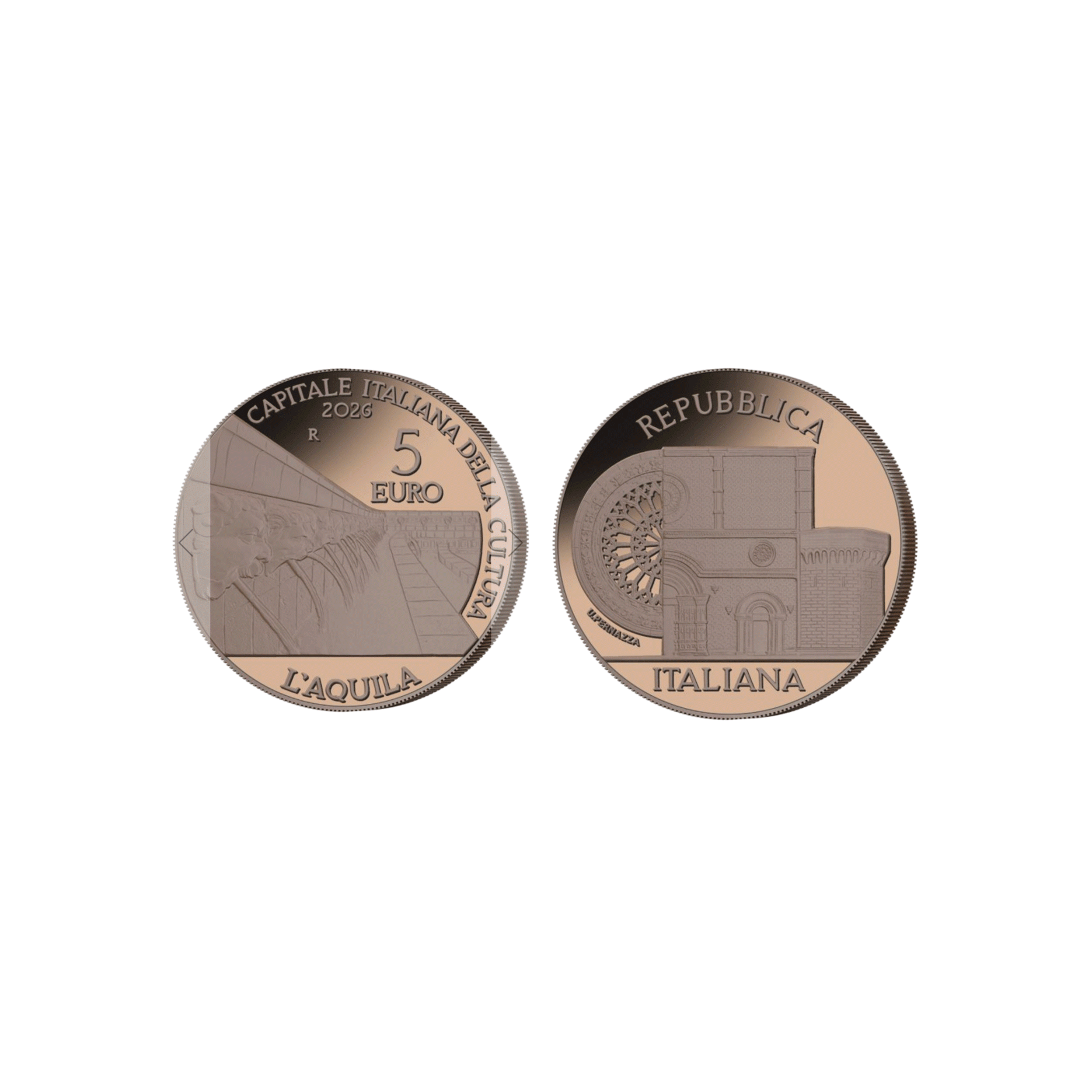 Rovescio: al centro un particolare della fontana delle novantanove cannelle. In alto, nel giro, la scritta “CAPITALE ITALIANA DELLA CULTURA”. In basso è posta la scritta “L’AQUILA”. Nel campo, in alto al centro, sono poste la “R” identificativa della Zecca di Roma, “2026”, anno di emissione della moneta ed il suo valore nominale “5 EURO”.