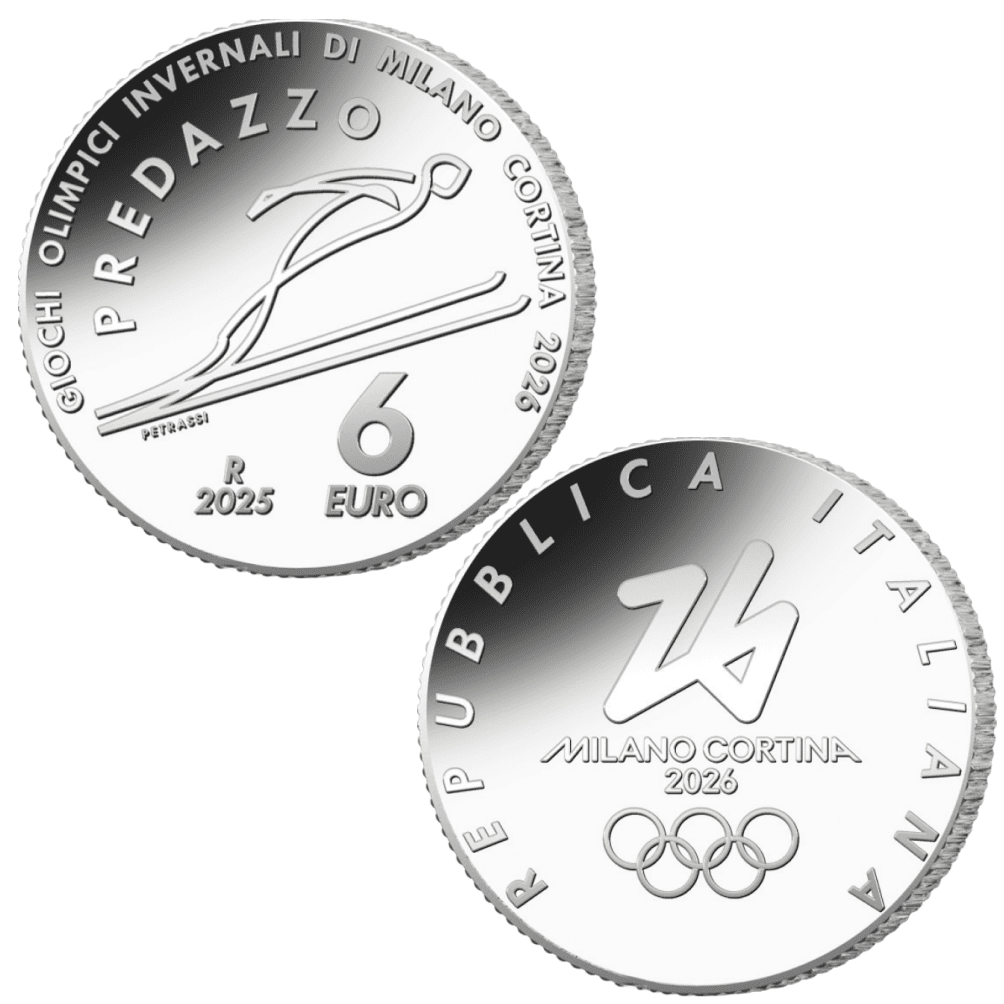 Rovescio: Al centro il pittogramma ufficiale della specialità olimpica del salto con gli sci. Nel giro la scritta “GIOCHI OLIMPICI INVERNALI DI MILANO CORTINA 2026”, subito sotto ad arco la scritta “PREDAZZO”, ovvero la città che ospiterà le gare del suddetto sport. Sulla sinistra, adiacente al pittogramma, la firma dell’autore “PETRASSI”. In basso “R”, identificativo della Zecca di Roma e “2025”, anno di emissione della moneta; sulla destra, sempre in basso, “6 EURO”, valore nominale della moneta.