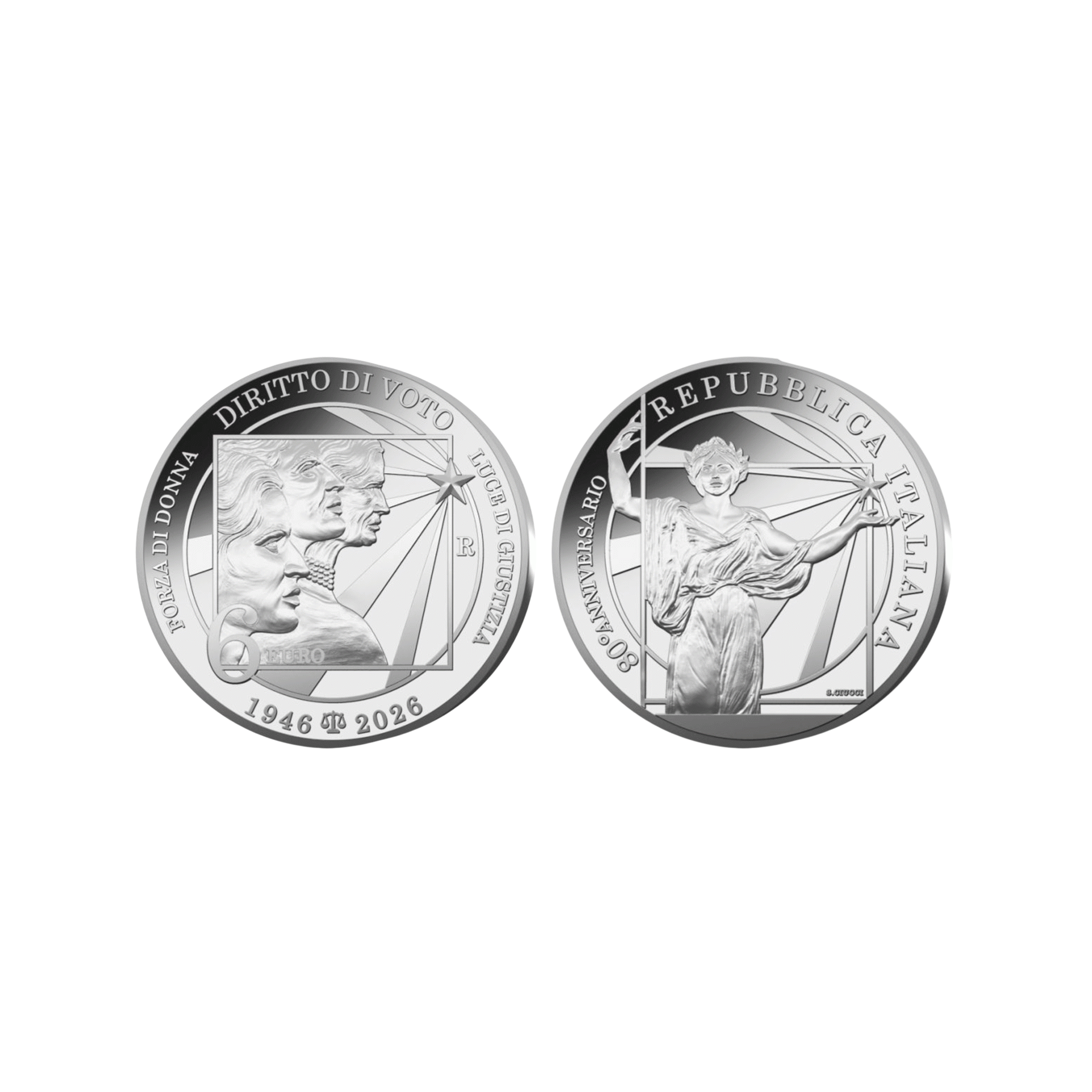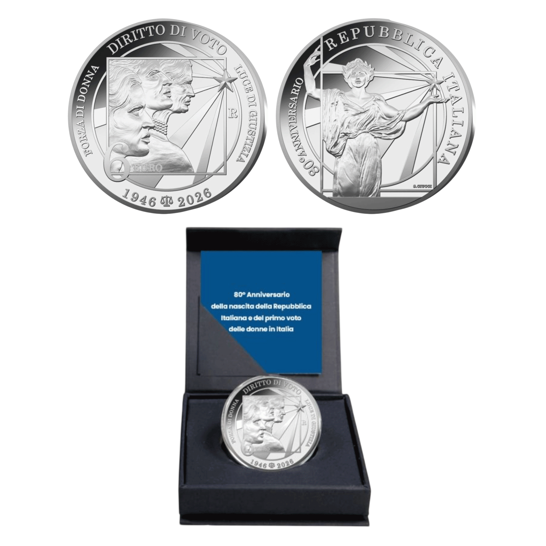 Rovescio: al centro sono rappresentanti i volti di tre donne di tre generazioni diverse con a destra la stella della Repubblica Italiana dalla quale si irradiano raggi di luce, immagine che evoca la conquista del diritto al voto. Nel giro sono poste le scritte “FORZA DI DONNA” E “LUCE DI GIUSTIZIA”, rispettivamente, a sinistra e destra. Nel giro in alto è posta la scritta “DIRITTO DI VOTO”, mentre nel giro in basso le due date “1946”, anno della nascita della Repubblica Italiana e della prima volta in cui le donne hanno votato, e “2026”, anno di emissione della moneta, separate dall’immagine di una bilancia simbolo di giustizia sociale. A sinistra, in basso, è posto il valore nominale “6 EURO”, mentre a destra è posta la “R” identificativa della Zecca di Roma.