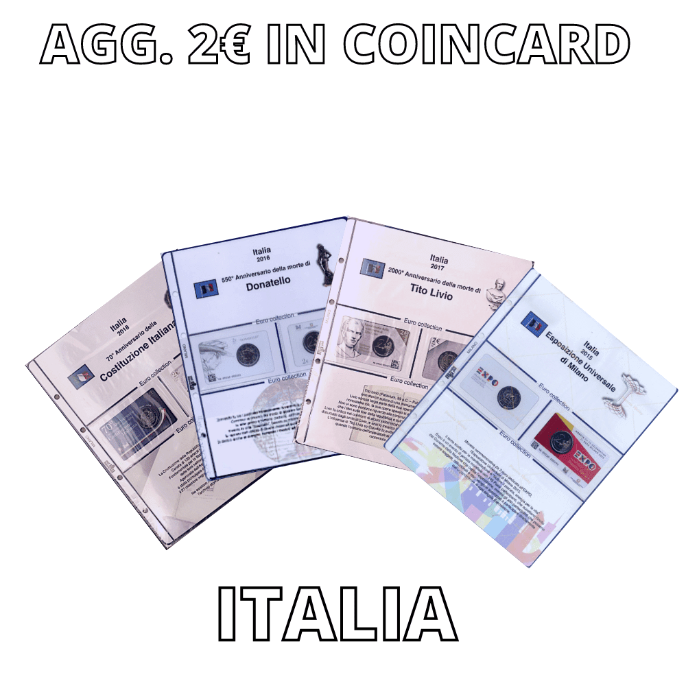Pagine di aggiornamento in Cristal trasparente con stampe create appositamente per le monete da 2 Euro commemorative Italiane emesse in Coincard