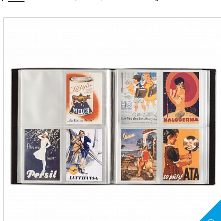 Album di alta qualità per cartoline con 50 buste trasparenti e fisse per sistemare 400 cartoline formato tasca 162 x 114 mm. Ogni busta può contenere fino a 8 cartoline (utilizzando entrambi i lati della busta). Lavorazione di alta qualità con cucitura ai bordi nonché rivestimento pregiato in similpelle.