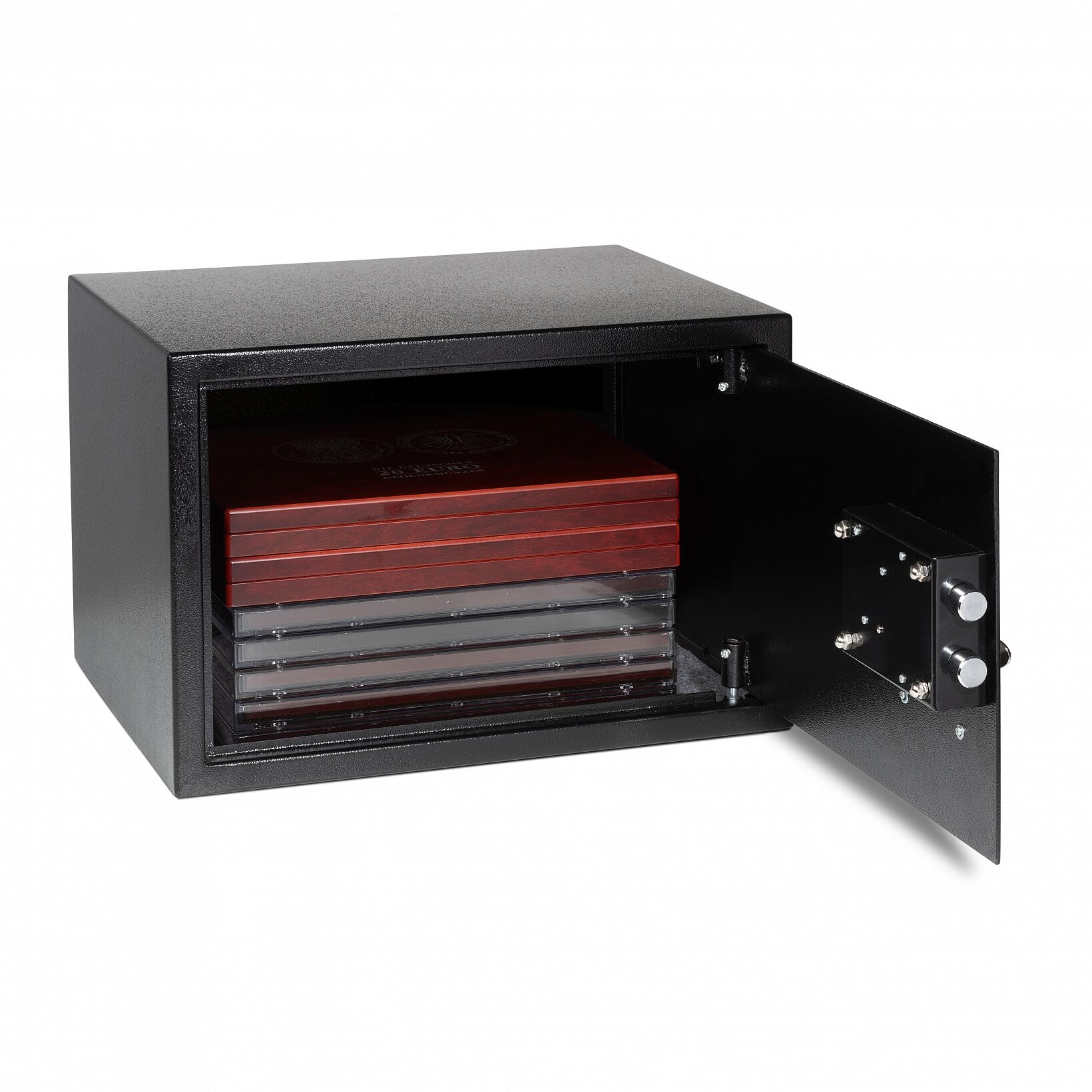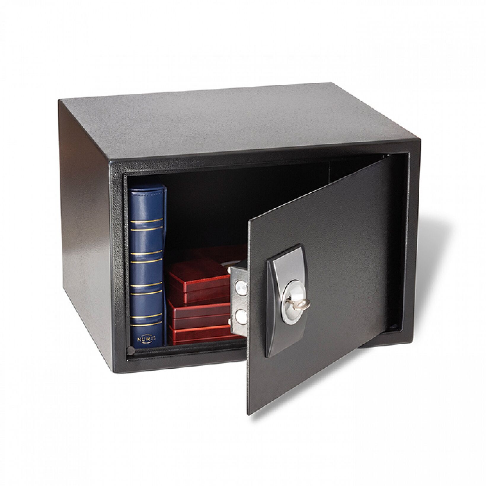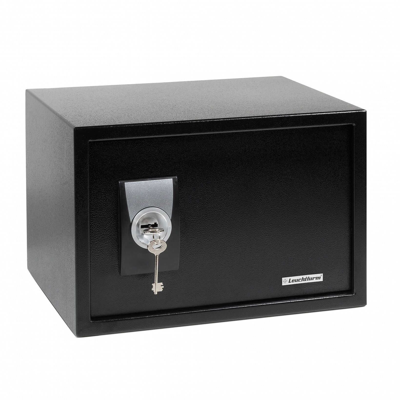 Proteggete i vostri tesori dal rischio di accesso non autorizzato e di furto con la cassaforte KAVENT di LEUCHTTURM. La cassaforte è in acciaio robusto. Le pareti hanno uno spessore di 2 mm, mentre lo sportello di 4 mm. La serratura è a doppia mappa e presenta 2 bulloni in acciaio massiccio.