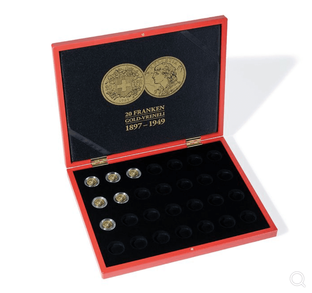Cofanetto portamonete rosso dal look nobile della bandiera svizzera. Per 28 monete d’oro Vreneli in capsule (diametro interno 21,5) . Con 30 vani rotondi.