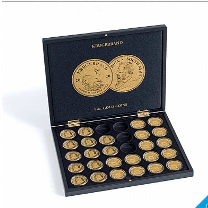 Cofanetto portamonete neri di alta qualità per riporre monete d’oro in capsule. Un inserto con superficie nera effetto velluto e 30 vani rotondi.
