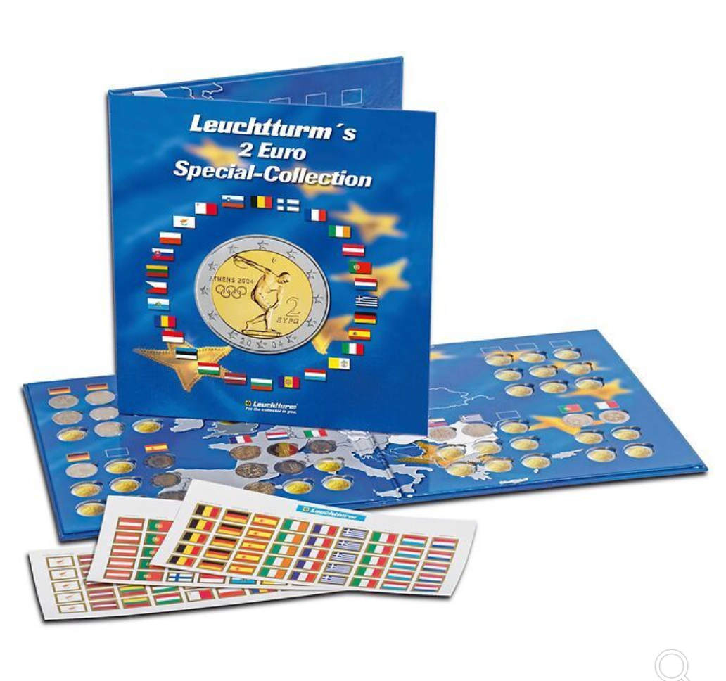 Può contenere 57 monete da 2 Euro ed è fornito con un set di bandiere adesive