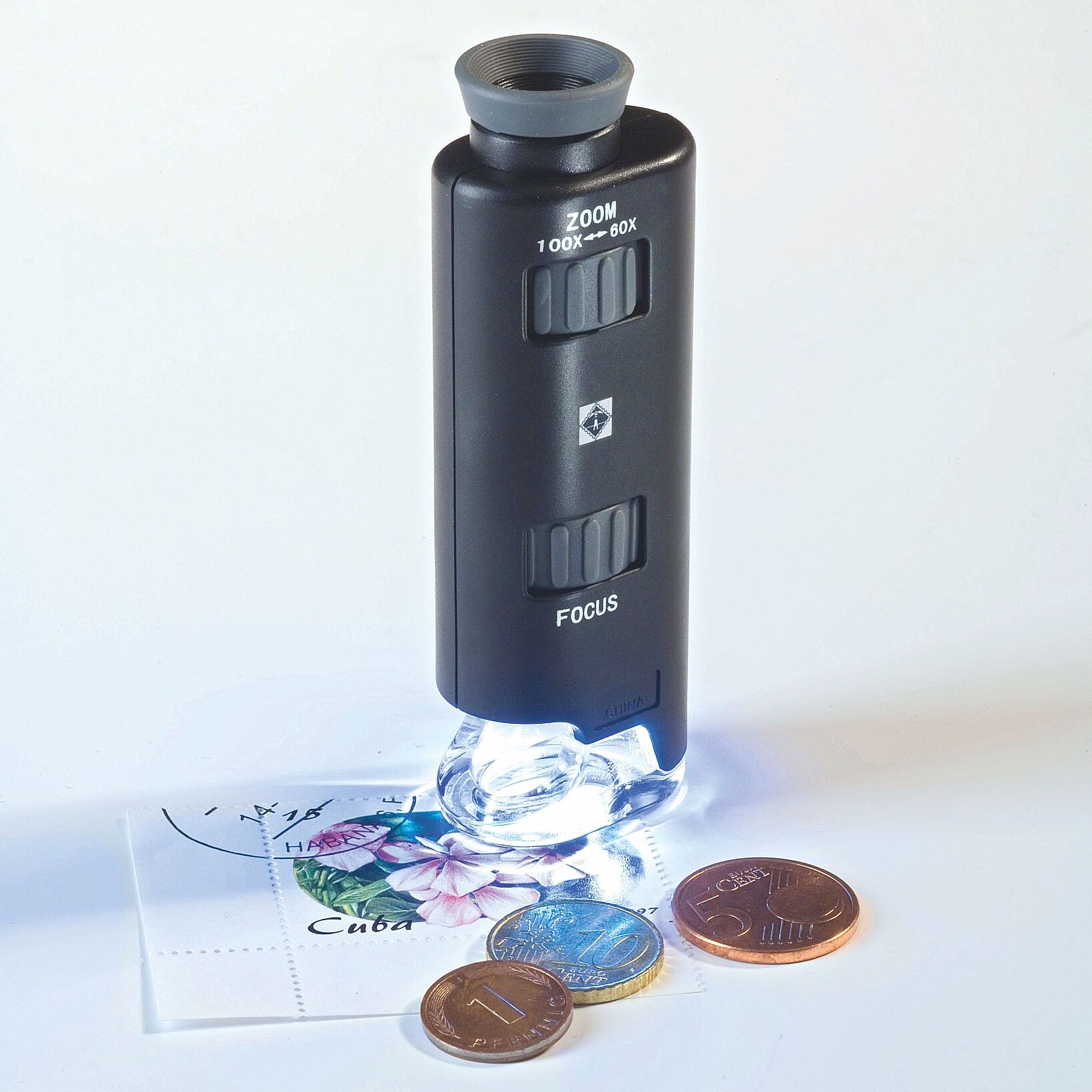Microscopio tascabile per numerose applicazioni: per filatelia, numismatica, minerali, piccoli componenti elettronici e molto altro ancora. Eccezionale chiarezza di immagine e di risoluzione. Continuo adeguamento tra 60x e 100x ingrandimenti. L’illuminazione LED consente la visualizzazione anche in condizioni di scarsa illuminazione. Realizzato in plastica nera. Fornito di batterie. Dimensioni: 88 x 30 x 20 mm.