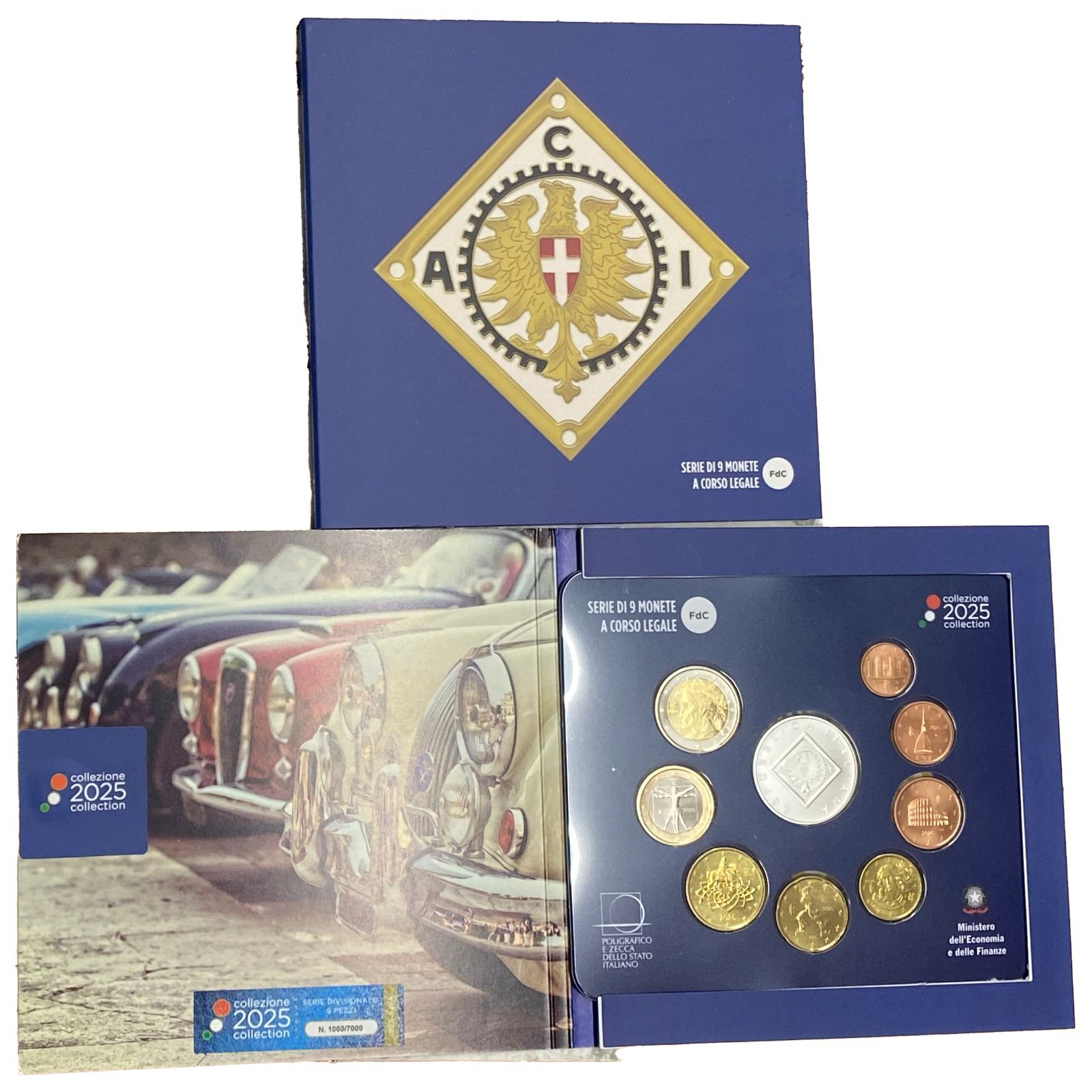 La serie contiene le 8 monete circolanti 2025 e la moneta da 3 euro in argento dedicata al 120° Anniversario della Fondazione di ACI – Automobile Club d’Italia, tutte in versione Fior di conio.