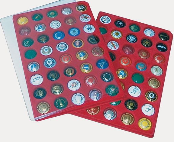 Vassoio in floccato rosso con 40 cave, completo coperchio trasparente per collezionare capsule di spumante.