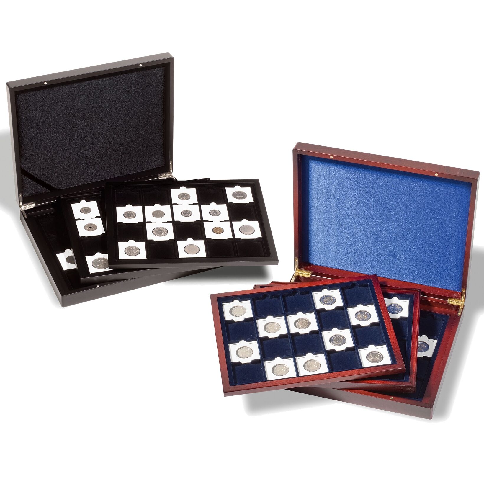 Cofanetto in legno VOLTERRA TRIO di alta qualità color mogano/nero per contenere 60 capsule o portamonete QUADRUM . Due vassoi più il fondo con una superficie nera simile al velluto contenenti 20 alloggi quadrati ciascuno da (50x50mm). I pannelli sono particolarmente stabili grazie al telaio in legno. Cuscino coperchio imbottito in raso nero. Chiusura magnetica sicura e poco appariscente.
