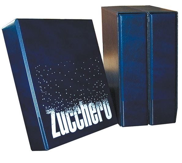 Raccoglitore per collezionare le bustine di zucchero,copertina in plastica blu stampa in bianco,cusstodia di cartone rivestita ,pagine in plastica trasparente con sei formatti differeri di tasche.